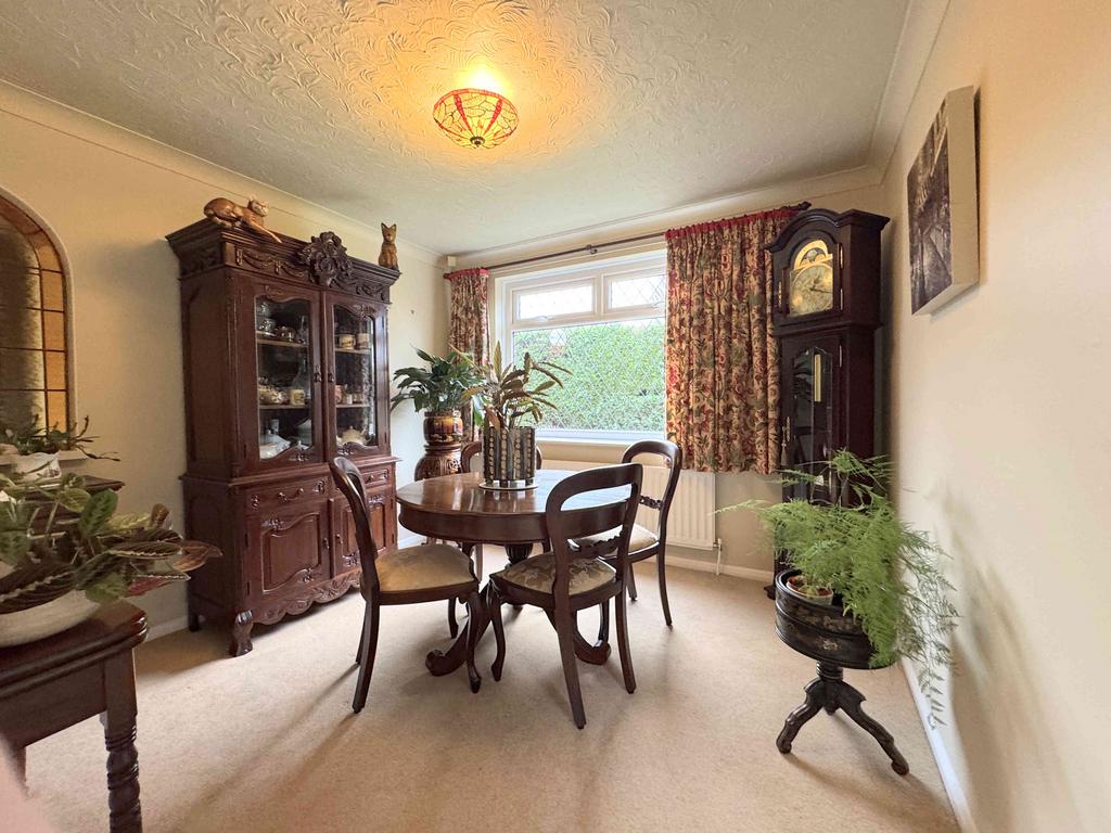 An archway from the inner hall opens into this dining room, which includes coving, a radiator, and a UPVC window.