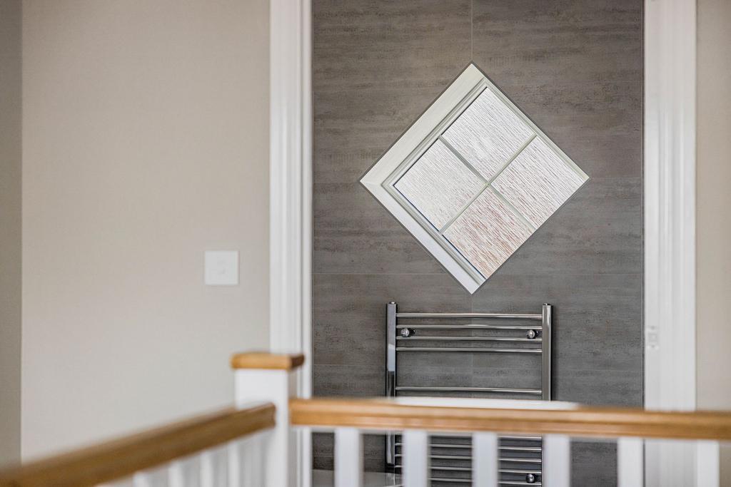 - Beautifully designed family bathroom with feature tiling and stylish diamond-shaped window
