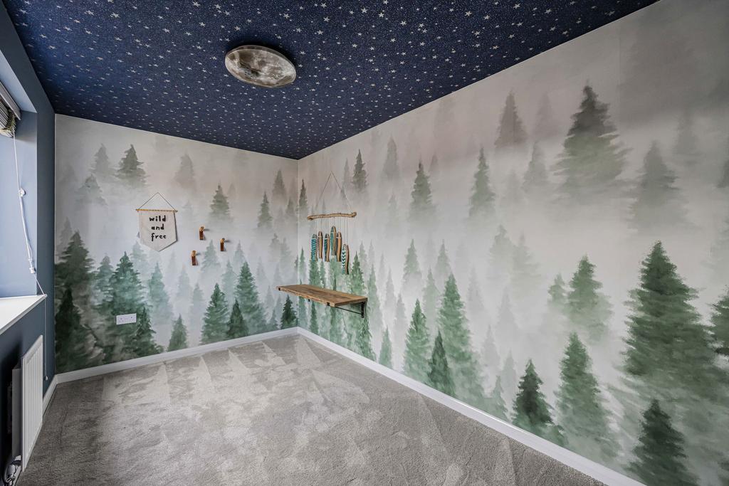 Upstairs, the home continues to impress, with a generous landing leading to three well-sized bedrooms. The principal bedroom spans the depth of the property and includes a stylish en-suite shower room with upgraded tiling and high-quality fittings. Bedrooms two and three are both attractively decorated, with bedroom three featuring a striking woodland mural that adds a creative touch. A beautifully designed family bathroom with contemporary wall tiles and a distinctive diamond-shaped feature window serves the remaining bedrooms.