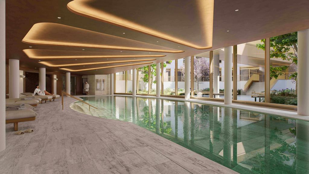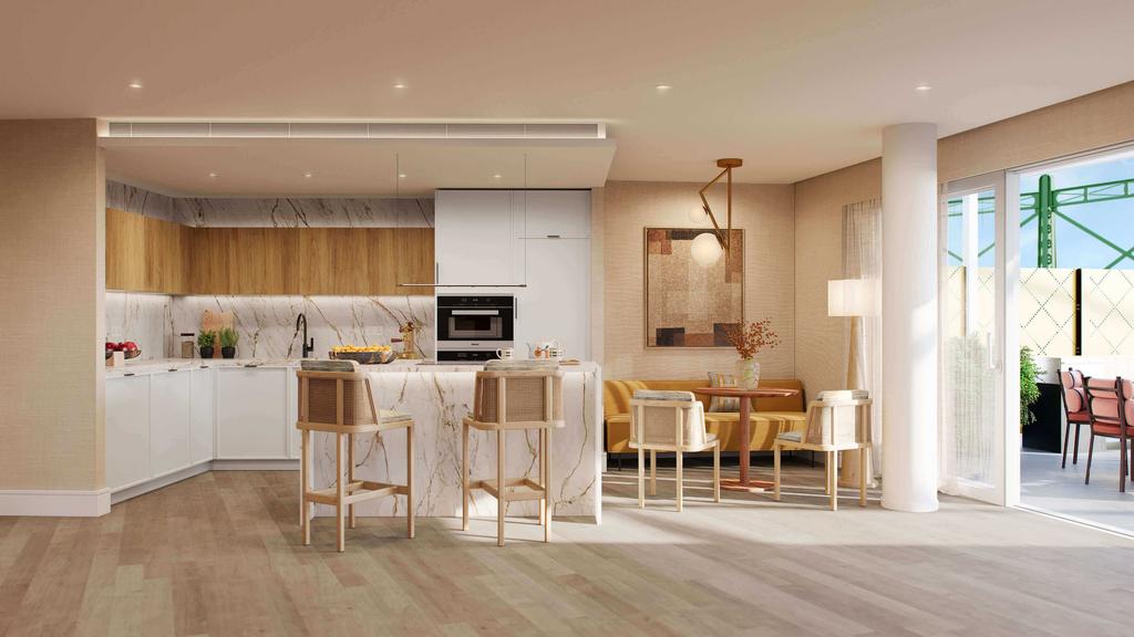 The principal bedroom includes a sleek en-suite bathroom, while the second bedroom provides flexibility for guests, family, or a home office. Floor-to-ceiling windows flood the apartment with natural light, enhancing the sense of openness and connection to the surrounding skyline.
