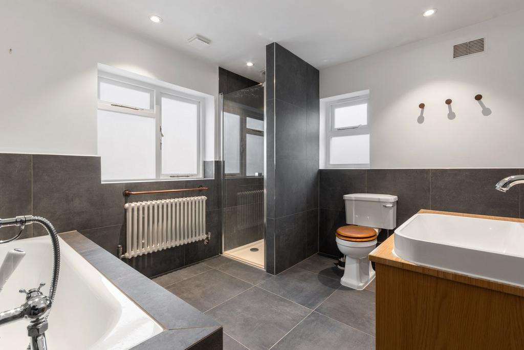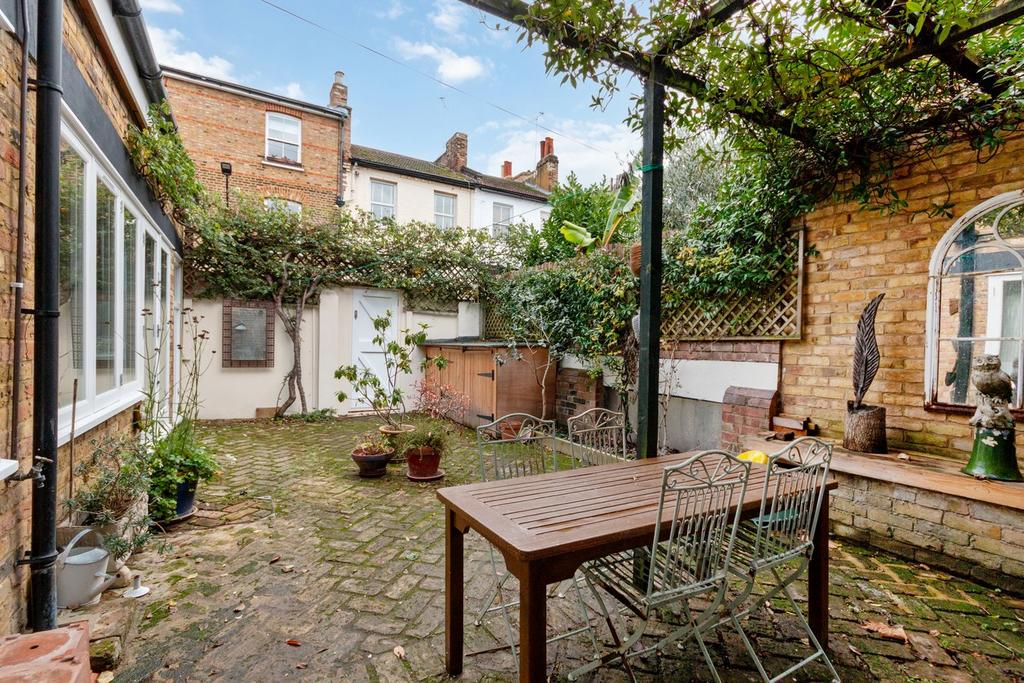 The property spans two floors and features a newly refurbished kitchen with doors opening onto a large courtyard garden, a separate reception room, two spacious double bedrooms, a modern family bathroom, and a convenient guest WC.