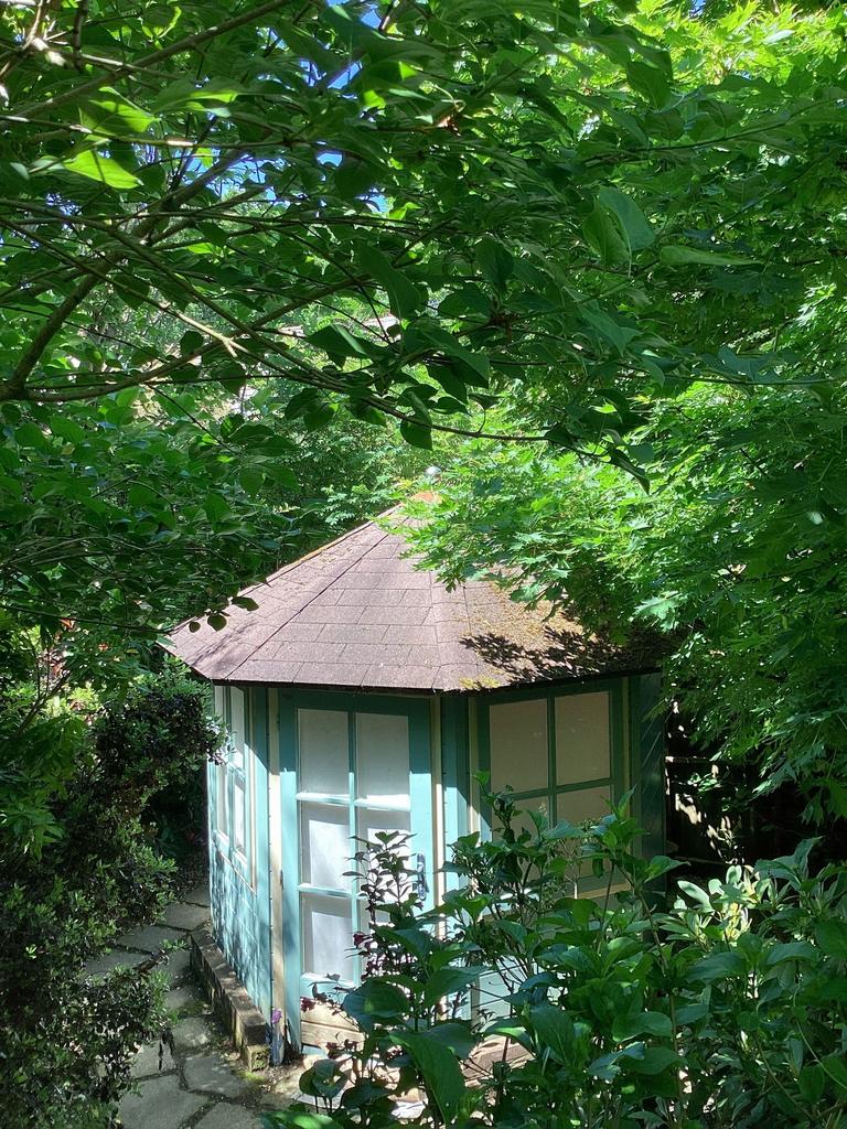 The house is fronted by the driveway and garage, with ample parking for 1-2 cars. A side gate leads around to the leafy back garden which has been landscaped and offers a paved seating area just off the conservatory. A pathway leads down through the mature shrubs and trees to an octagonal summerhouse which sits at the bottom of the garden.