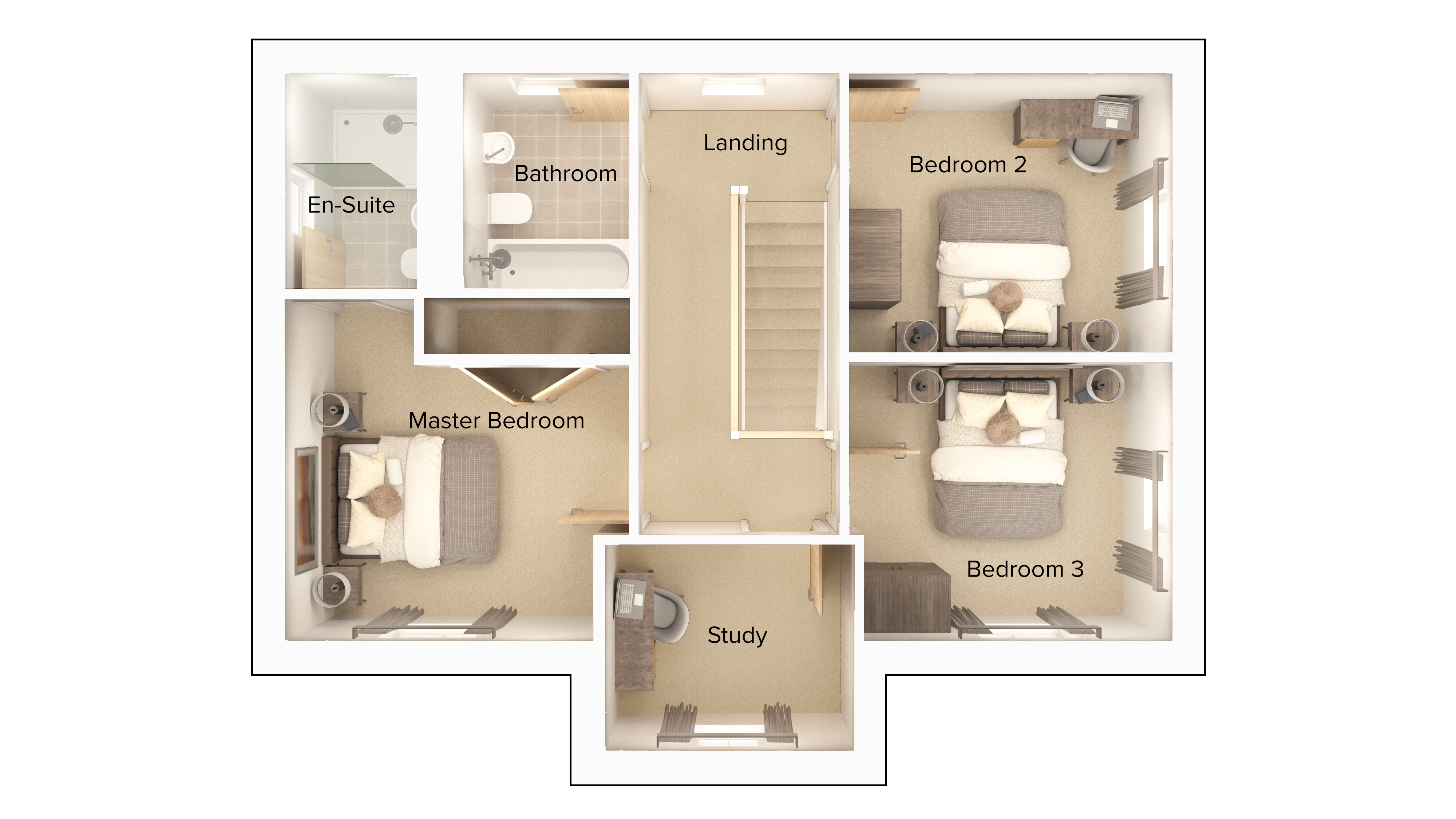 Two additional double bedrooms are ideal for children or guests, while the fourth bedroom, currently styled as a study, provides a versatile space for homeworking or a hobby room. A sleek family bathroom with premium fittings serves the additional rooms.
