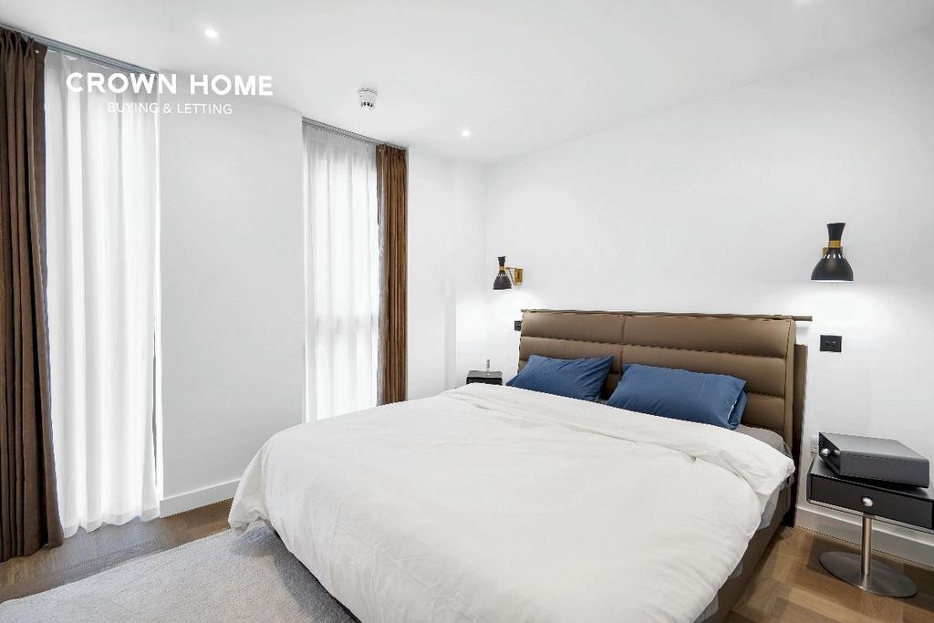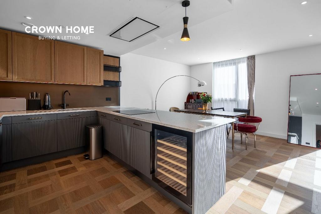 Flooded with natural light through floor-to-ceiling windows, this elegant 3-bedroom apartment boasts a bright and open living space. The modern kitchen is fully equipped with premium integrated appliances, including a wine fridge, fridge, freezer, microwave, and oven, making it perfect for both entertaining and daily living. The highlight is the expansive 842 sq. ft. terrace, offering breathtaking views of the Shard, River Thames, and Canary Wharf, seamlessly extending the indoor-outdoor experience.