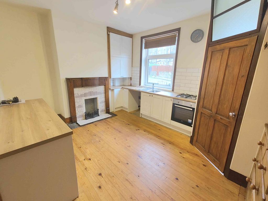 A generous and well-appointed kitchen that features laminated work surfaces to either side of the room. With an integrated oven, integrated hob, wooden floor, central light fitting, fitted cupboards, open fireplace, space for a fridge/freezer, uPVC double glazed window to the rear elevation and a stainless steel sink with stainless steel mixer tap.