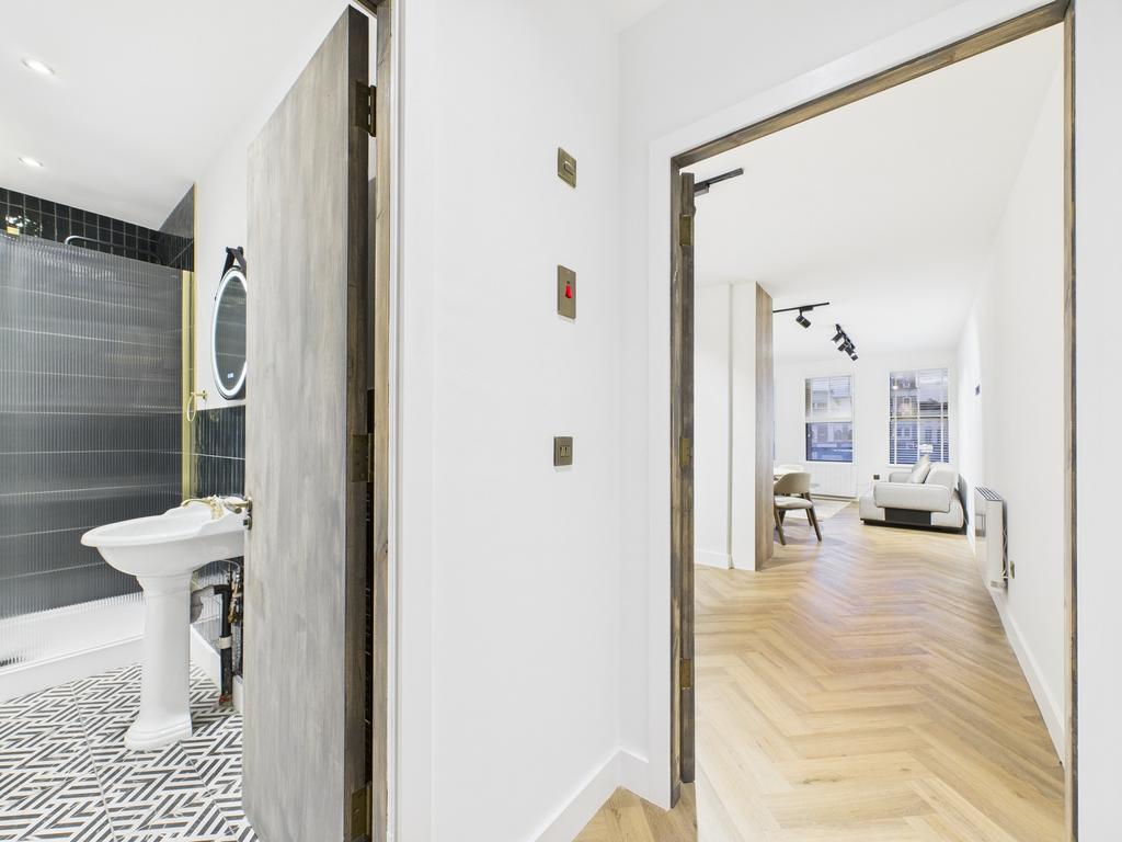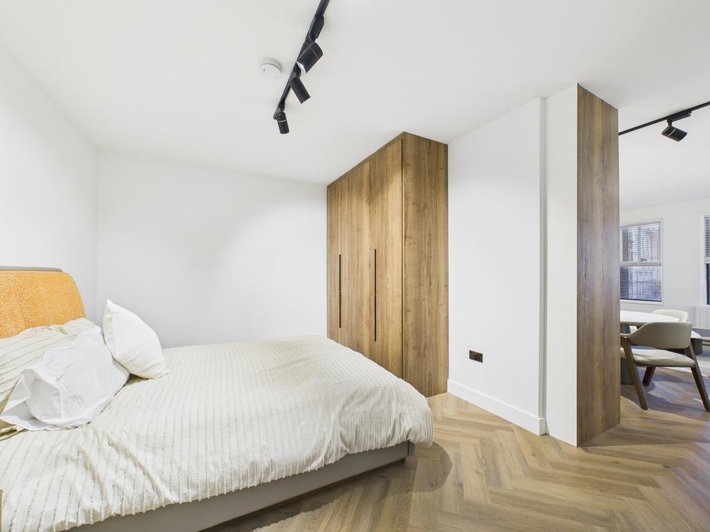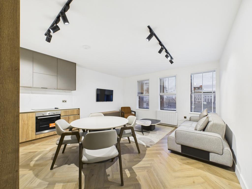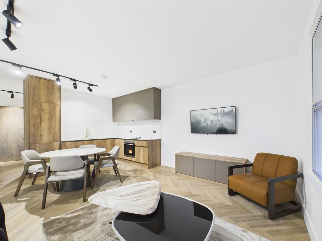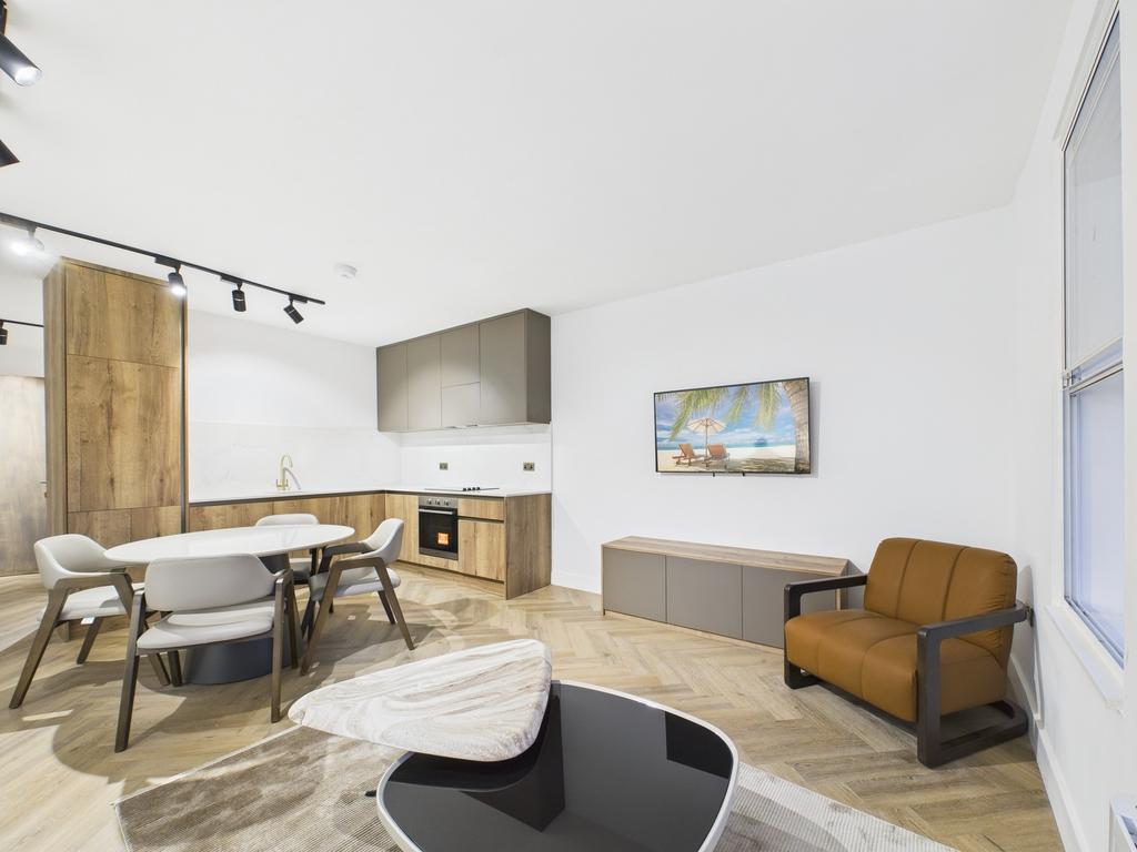 The apartment benefits from a bright and spacious layout, with generous windows that bring in excellent natural light. The standout feature is the huge, fully fitted kitchen, designed with ample storage, modern appliances, and a clean, sophisticated aesthetic.