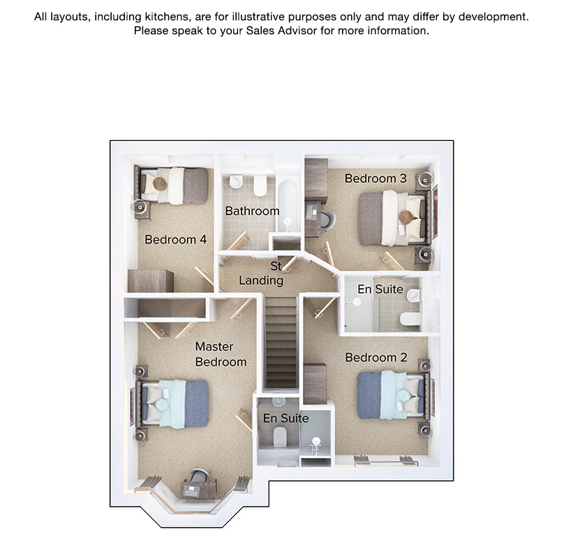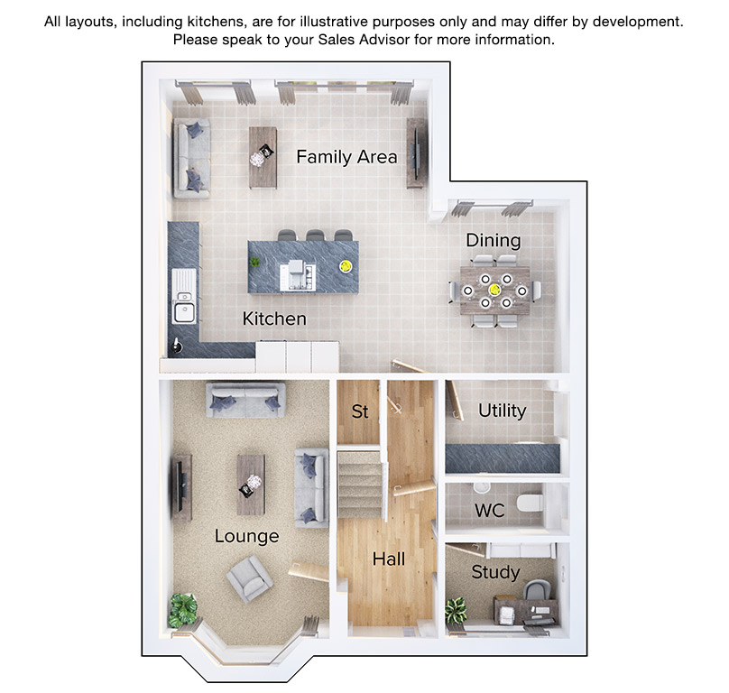 Artists' impressions are drawn from an imaginary viewpoint and are intended to give an impression of the house design. Photographs may be from Seddon Homes developments across the North West. Neither the artists' impressions nor the photographs are intended to give an accurate description of any specific property offered for sale, its setting or its surroundings. These do not show final details of gradients of land, boundary treatments, local authority street lighting or landscaping. We aim to build according to the layout, but occasionally we do have to change house designs, boundaries, landscaping and the positions of roads, footpaths, street lighting and other features as the development proceeds. Floor plans: The dimensions shown are approximate. Each home is built individually and so the precise measurements may vary from that shown, although every endeavour is made to make the dimensions as accurate as possible. We give maximum dimensions that may include fitted wardrobes, sloping ceilings, bay windows, and any other features. All layouts, including kitchens, are for illustrative purposes only and may differ by development. Please speak to your Sales Advisor for more information.