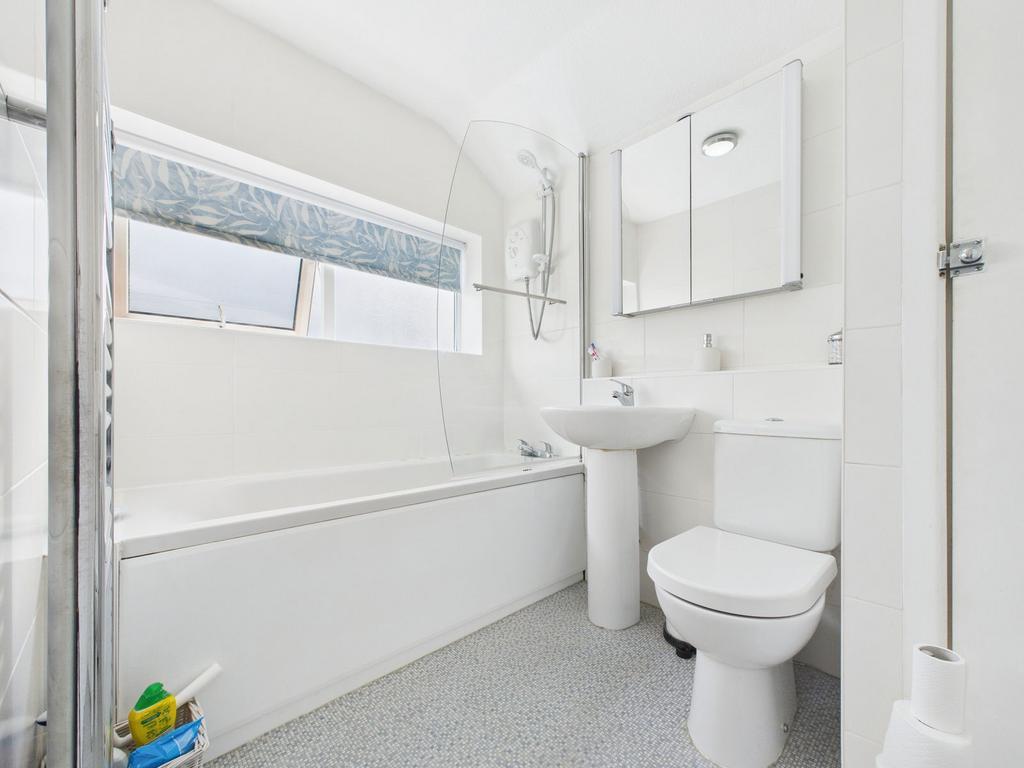 BATHROOM A well presented family bathroom comprising a low level flush WC, pedestal wash hand basin and a panelled bath with shower over and protective glass screen. Finished with tiled walls, an obscure uPVC double glazed window and a chrome heated towel rail.