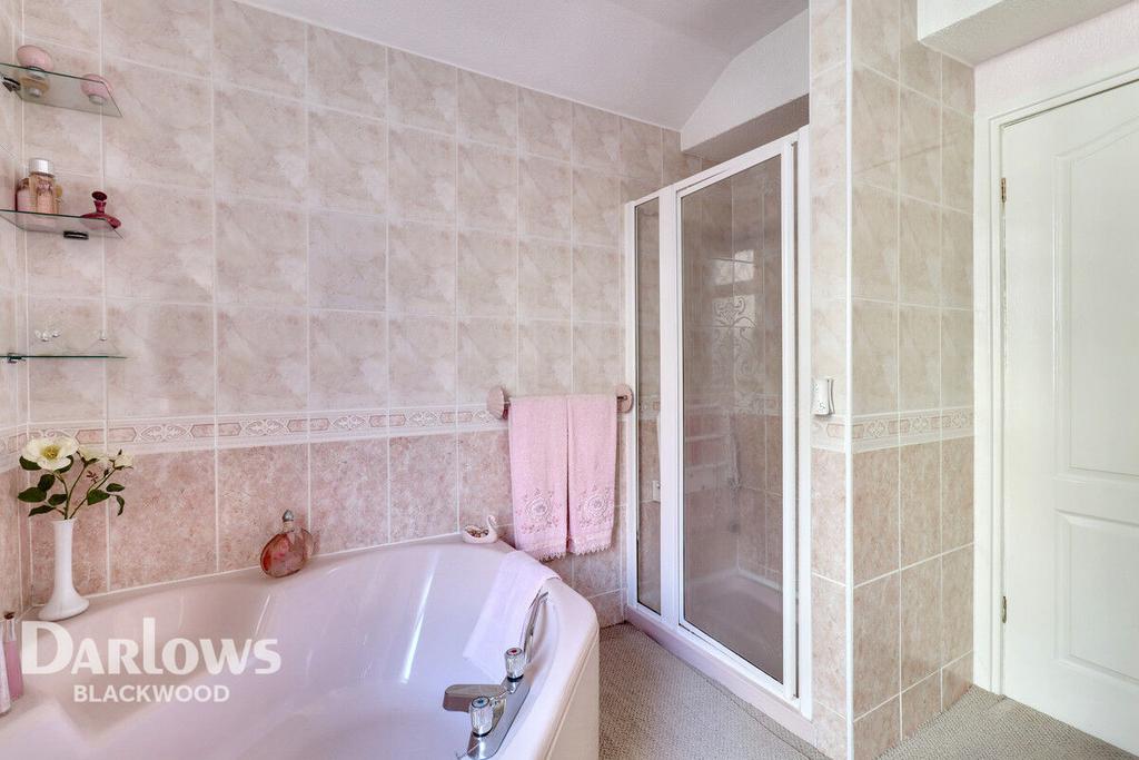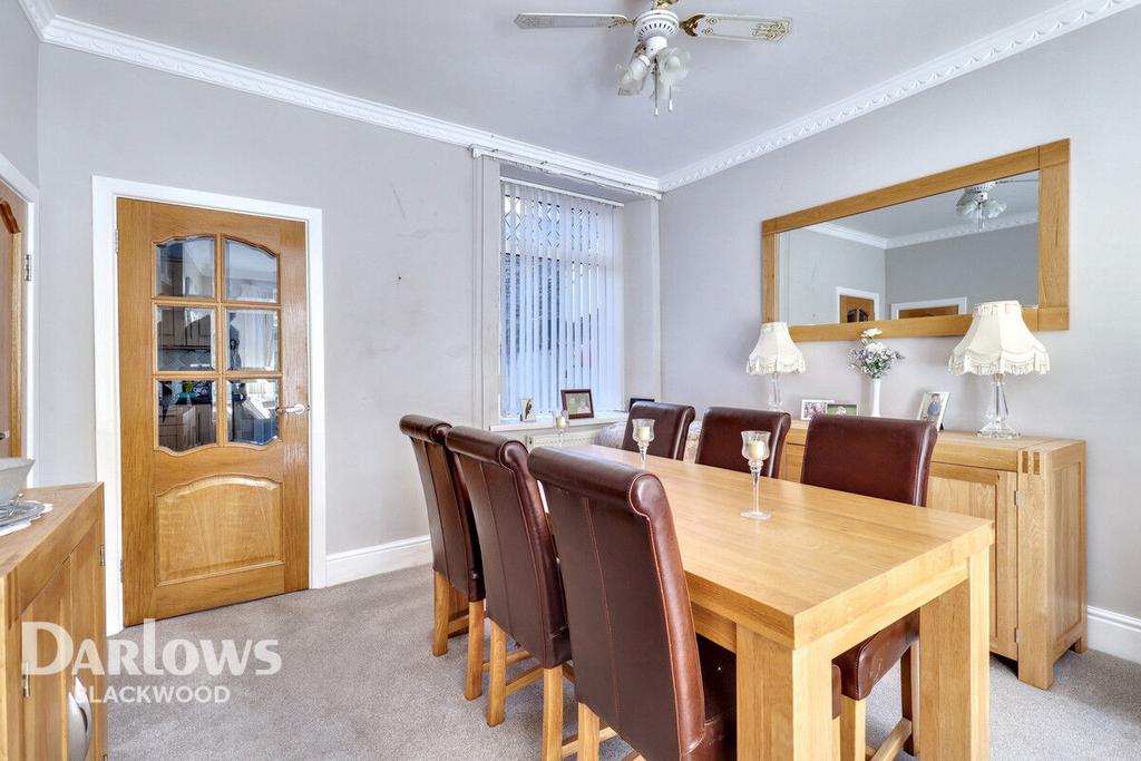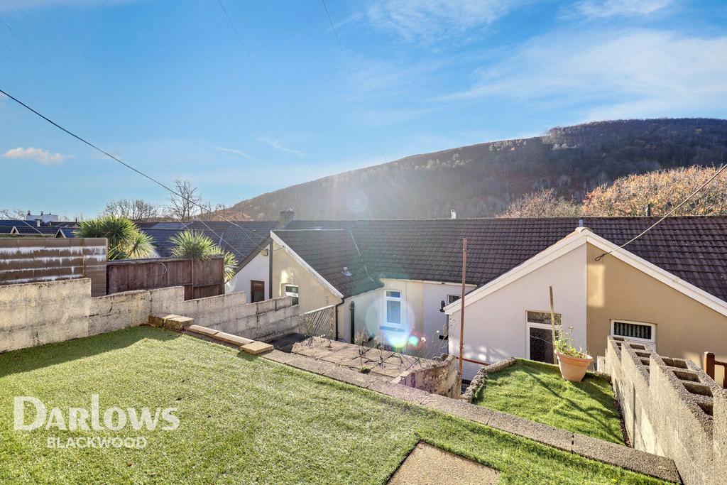 The rear garden rises steeply in multiple tiers, providing several areas to sit and enjoy the sunshine along with the beautiful hillside and valley views that Deri is known for. At the top of the garden sits a generous garage with a storage room beneath, plus additional storage space with folding-door access from the rear lane.