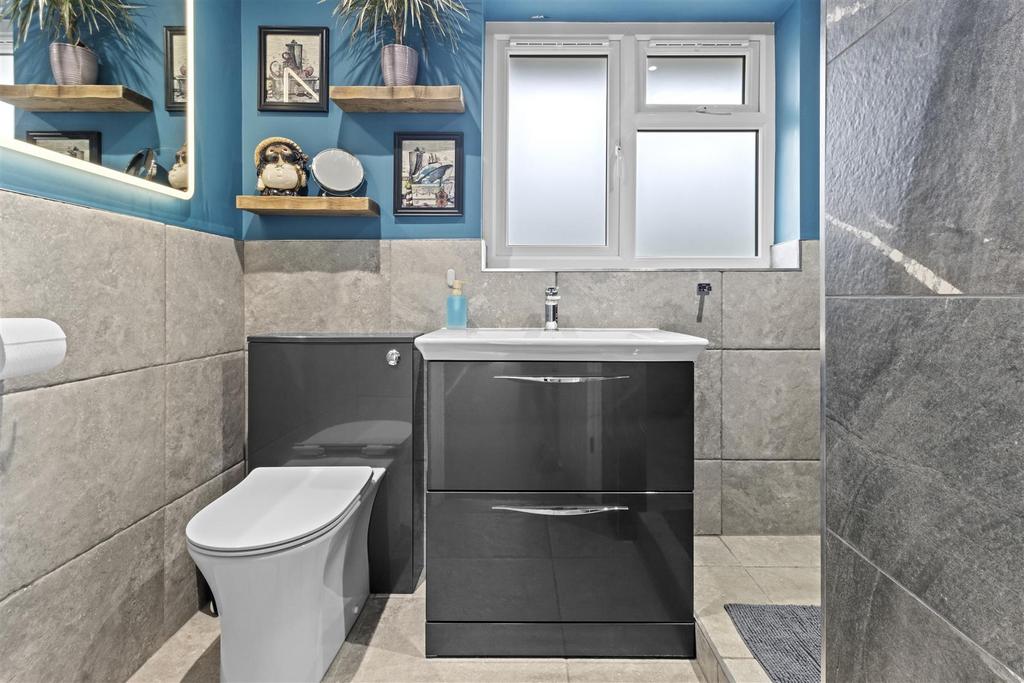 Modern suite comprising walk-in shower, WC and wash basin with storage beneath. Flova fitted shower. Heated towel rail. Part tiled walls. Obscured window. Under floor heating.