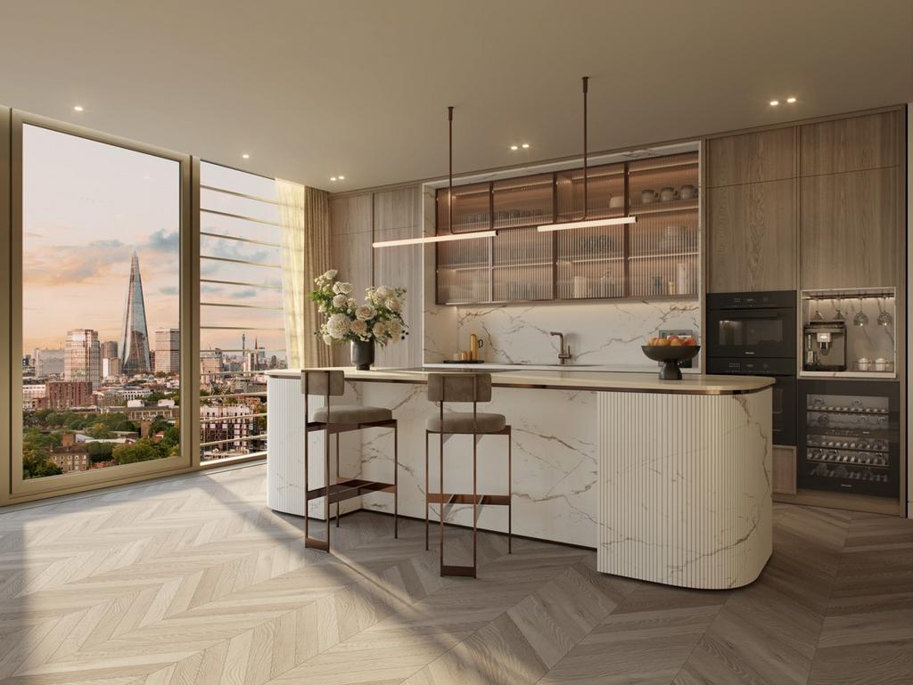 A showpiece designer kitchen blends gorgeous marble worktops with top-of-the-range appliances, breakfast bar seating, and extensive built-in storage, further underscored by wine column and espresso bar – while enjoying breathtaking city vistas toward The Shard.