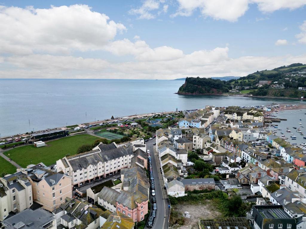 The large living room with heaters and a feature fireplace housing an electric fire has a window to the front with an outlook across to Teignmouth Den & Pier. Off the living room is the kitchen, also with a front aspect, fitted with a range of base and wall units, single bowl single drainer sink unit, tiled splash backs and space for appliances.