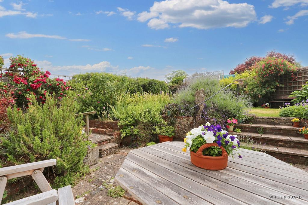 Church View Cottage is timber-framed with brick infill and a tiled roof. Its charming aesthetic appeal is greatly enhanced by mature front gardens that are enclosed by a pretty wooden picket fence and mature hedging. Predominantly laid to lawn with well-established plants and shrubs as well as a garden pond, the front gardens wrap around the side of the house and lead to a south westerly facing rear garden. The walled rear garden has a patio terrace extending from the house, with steps leading up to a lawned garden with an array of well stocked borders.