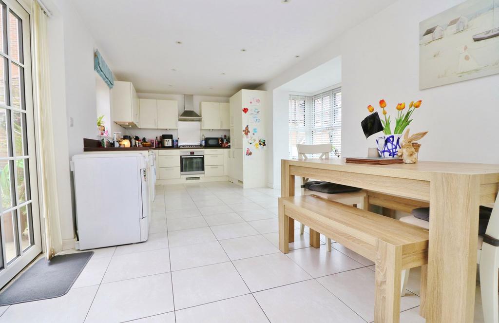 The spacious kitchen/diner has been fitted with a modern range of wall and base units with a built-in oven and gas hob with extractor over and an integrated fridge/freezer. There is appliance space for a dishwasher and washing machine, a window overlooking the courtyard, a bay window to the side and French doors leading out to the garden.