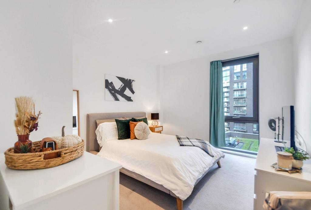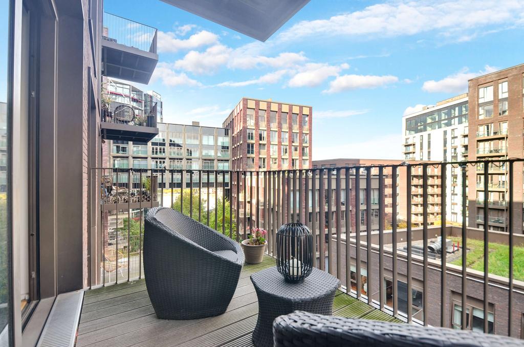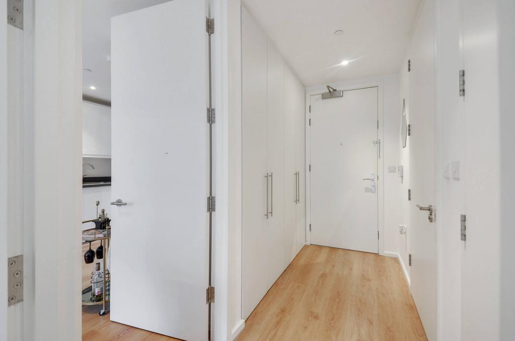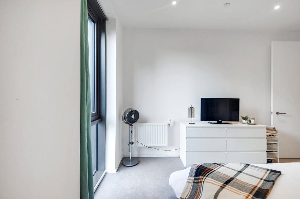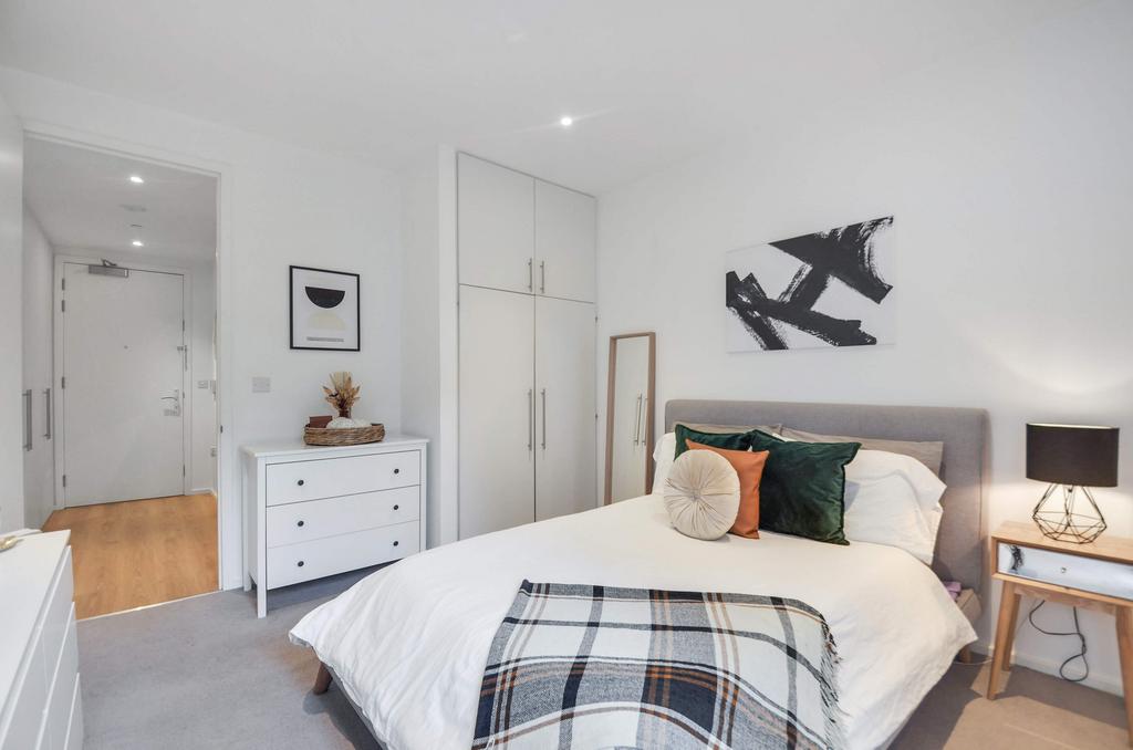 The bedroom includes a fitted wardrobe, offering generous storage space while maintaining a sleek, minimalist aesthetic. Additional highlights include central heating for year-round comfort, a private balcony with views of the River Thames ideal for morning coffee or evening relaxation, and access to secure bike storage, providing both practicality and peace of mind.