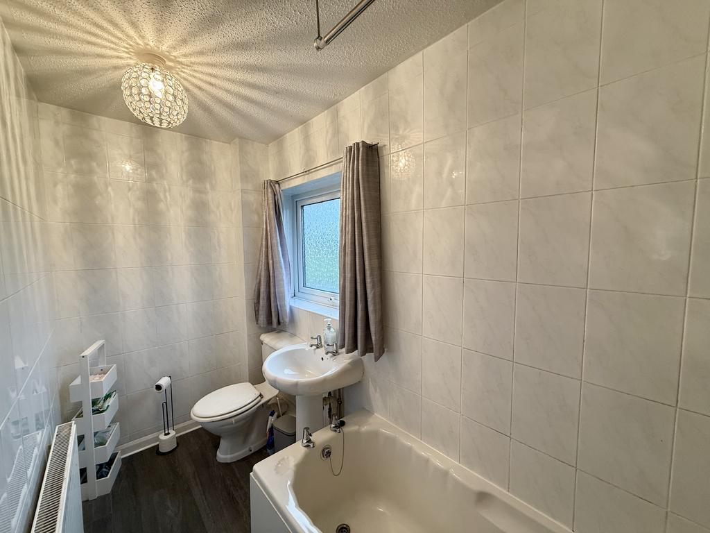 BATHROOM/WC - 9.10 x 4.5 -Panelled bath, electric shower over with shower curtain, low level WC, pedestal washbasin, tiled to all walls, laminate flooring, double radiator,UPVC double glazed window to front.