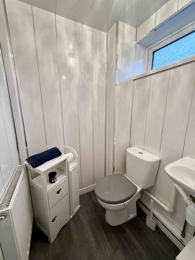 WC - 4.4 x 4.2 - Low level WC, washbasin, plastic cladding to walls, UPVC double glazed window, laminate flooring, radiator.
