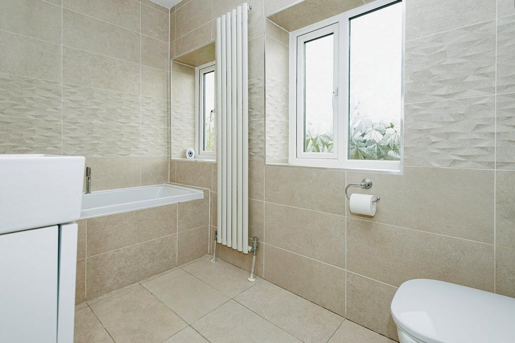 Bathroom - Recently fitted modern fully tiled suite comprising a push-button WC, a wash hand basin set into a vanity unit, an integral bath with a shower attachment, two frosted rear aspect double glazed windows and a vertical modern radiator.