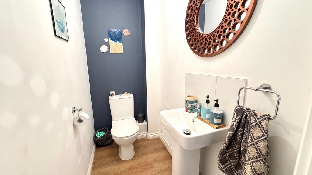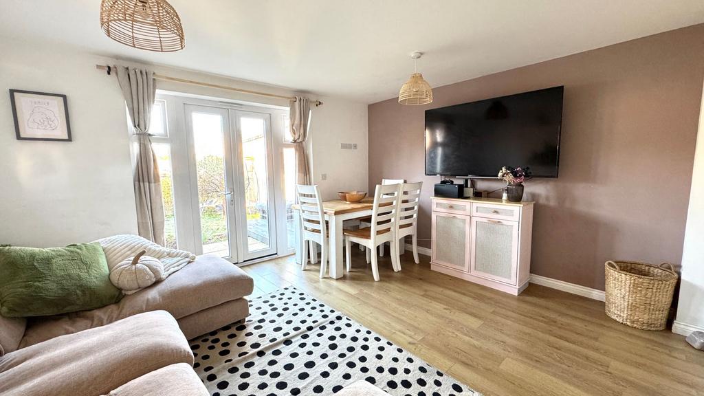 The spacious lounge enjoys double doors opening directly into the rear garden, creating a bright and airy living space. A WC and convenient storage cupboard complete the ground floor.