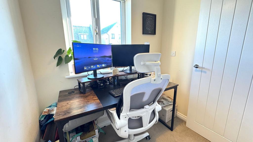 Upstairs on the first floor are two well-proportioned bedrooms – one double and a generous single – along with a modern family bathroom comprising a full-size bath, low-level WC, and wash hand basin in a crisp white suite. A further door leads to an inner landing, currently utilised as a home office area, with stairs rising to the second floor.