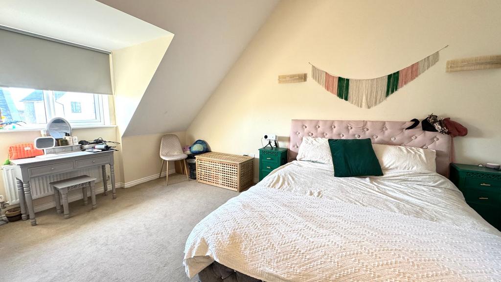 The top floor hosts a very large principal bedroom with built-in wardrobes and an en-suite shower room. The en-suite includes a double shower, low-level WC, wash hand basin, and a skylight window, allowing natural light to flood the space.