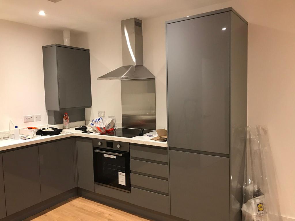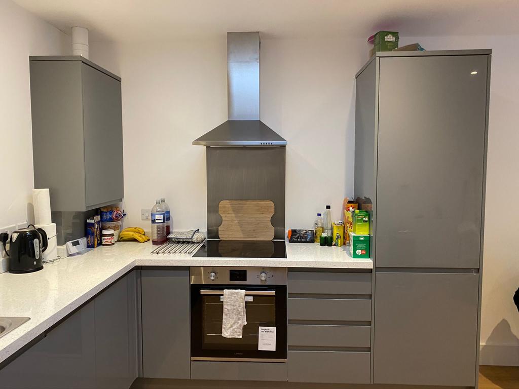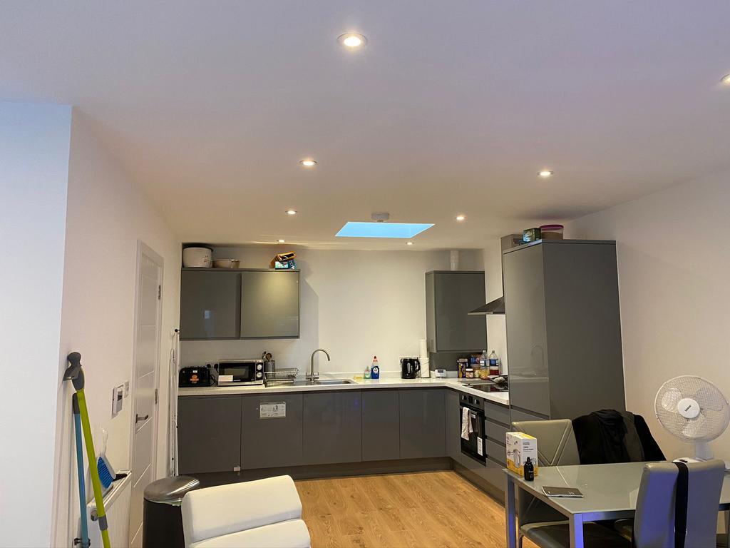 Open plan kitchen with integrated electric hob and oven