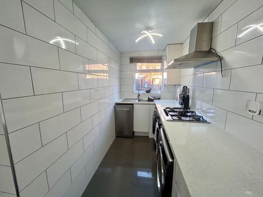 The modern fitted kitchen is a true highlight, featuring crisp white tiled walls, a sleek worktop, a gas hob, integrated oven, and space for a washing machine and dishwasher. The galley style is maximised for efficiency and space.