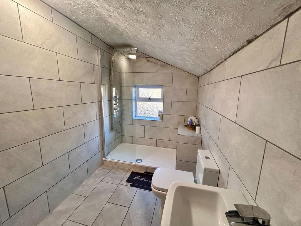 The contemporary shower room has stylish grey tiling, a large walk-in shower enclosure, a W/C, and a basin.