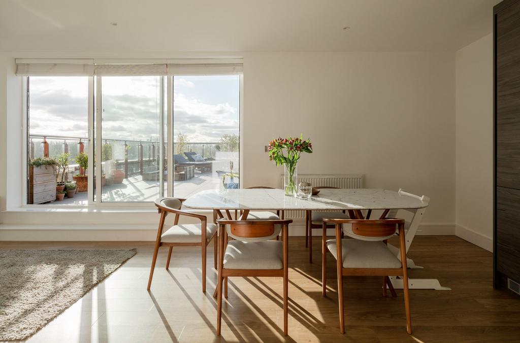Step through into the hallway, where there’s in-built storage for coats and shoes along with plumbing and electrics for a washing machine; the boiler is housed here too. The wooden flooring and neutral walls coordinate this spacious entrance with the open-plan dining kitchen and living area beyond, which boasts a show-stopping view of the city skyline through a large casement window and sliding doors leading to the rooftop terrace.