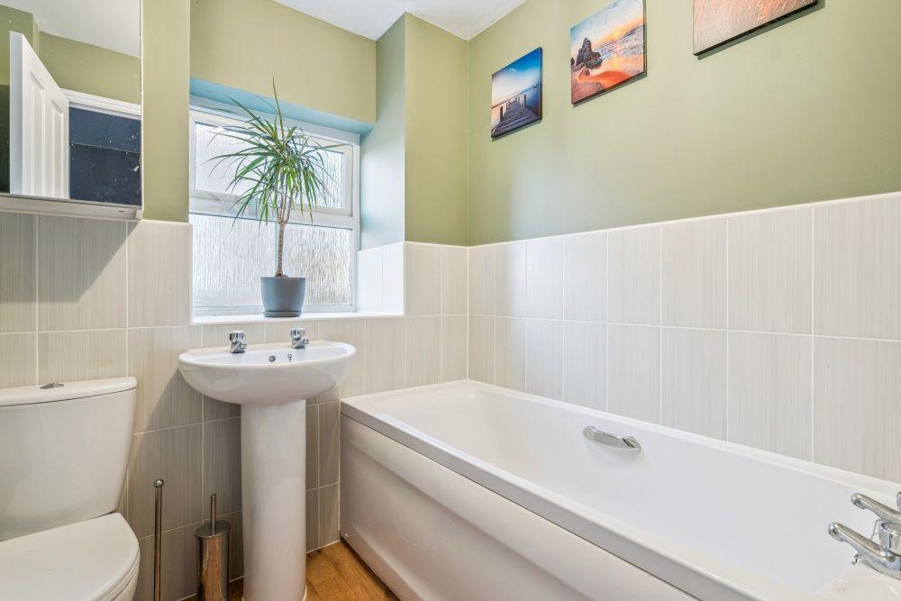 A family bathroom, fitted with a bath and overhead shower, sits between the two bedrooms and completes the upstairs layout.