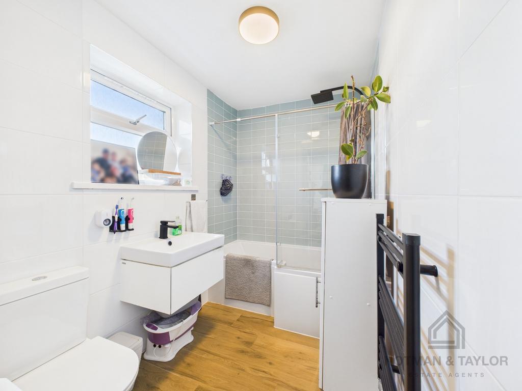To the rear, the modern kitchen/diner has been recently updated, fitted with shaker-style cabinetry, wood-effect worktops and space for a family dining table. A side door opens directly into the attached external utility room, providing excellent storage and room for appliances. Completing the ground floor is the contemporary family bathroom, finished with soft blue tiling, a rainfall shower over the bath and a fresh, clean design.