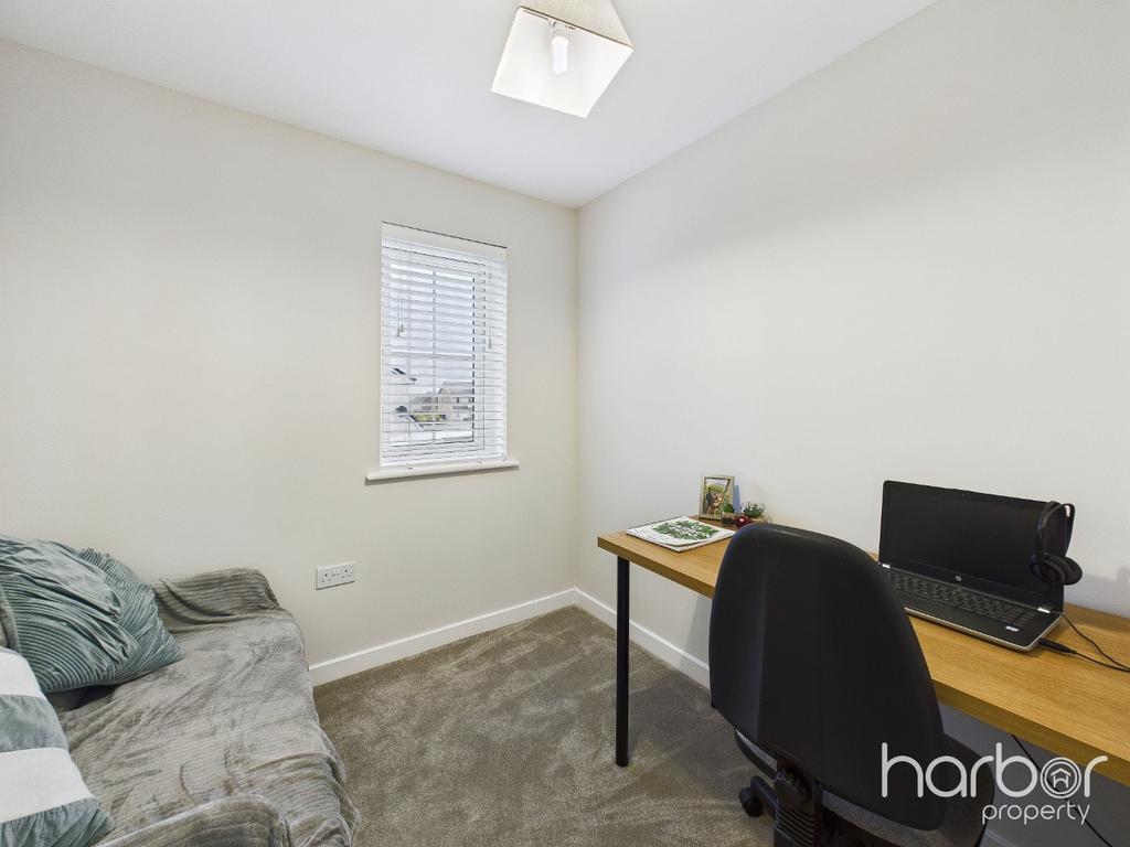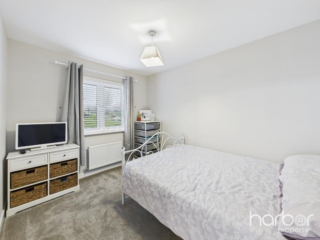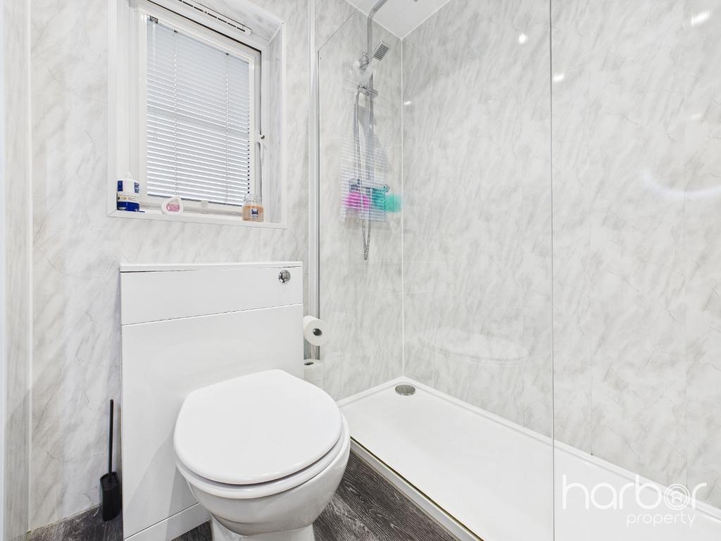 Upstairs, the home continues to impress with three well-proportioned bedrooms, each offering comfortable space for free-standing furniture. The beautifully upgraded family bathroom comprises a WC, hand basin with integrated storage, and a luxurious walk-in rainfall shower.