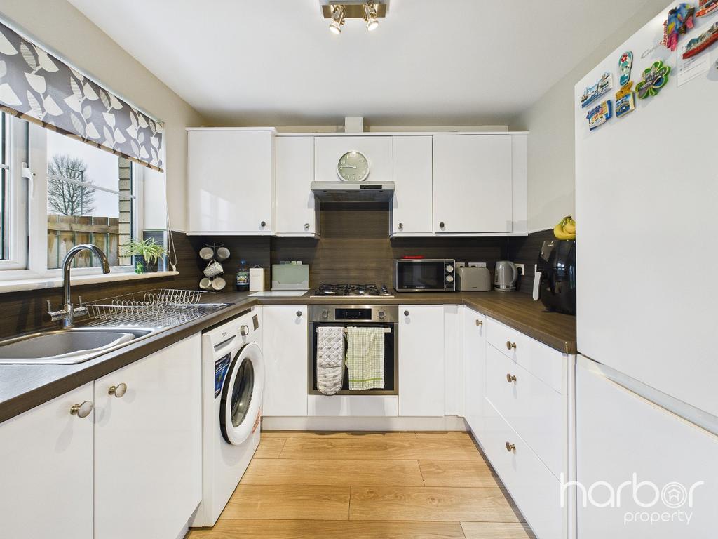 To the rear, the impressive open-plan kitchen and dining area provides the perfect hub for day-to-day living and entertaining. The kitchen is fitted with modern units and includes an electric oven, gas hob, and stainless steel sink. A set of patio doors allows natural light to flood the space and opens directly onto the rear garden, while a large storage cupboard enhances practicality.