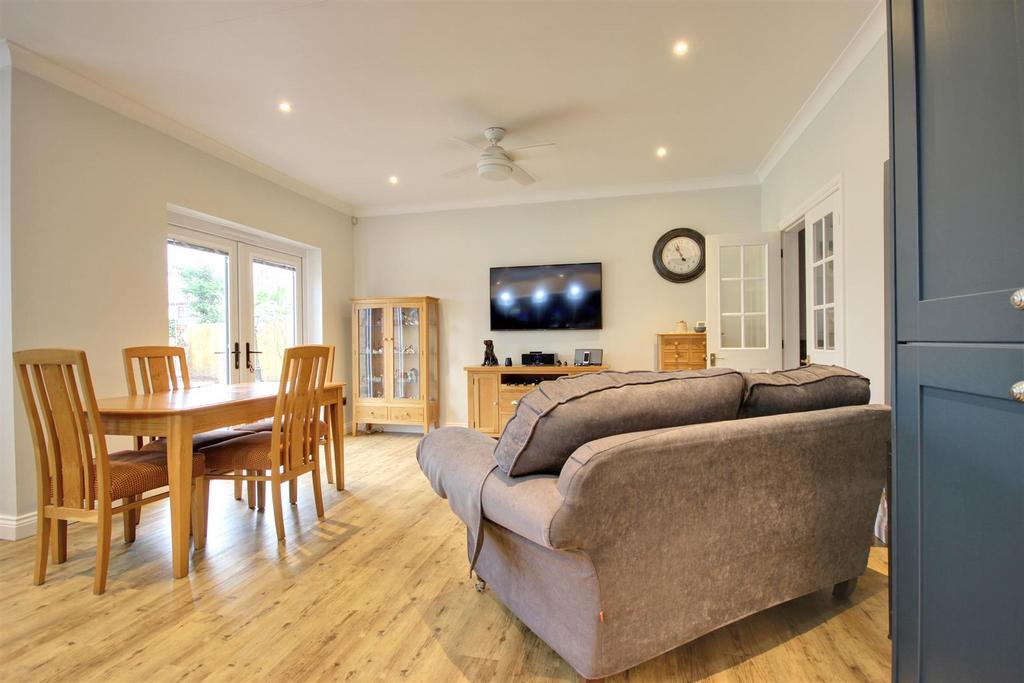 Living Dining Kitchen - 8.10m x 5.61m decreasing to 4.57m (26'7" x 18'5" d - Accessed via double doors from the entrance hallway. Having uPVC double glazed window and uPVC double glazed French doors overlooking the rear garden. An extensive range of Shaker base and wall units complemented with beautiful quartz work surfaces, induction hob with built-in air fryer oven, microwave/combination oven and integral coffee machine, integrated dishwasher, Quooker hot water tap, and integrated fridge. There are two sink units and a beautiful central island creating a superb hub area. All beautifully finished with integral lighting and wood laminate flooring. Wall mounted air conditioning unit.