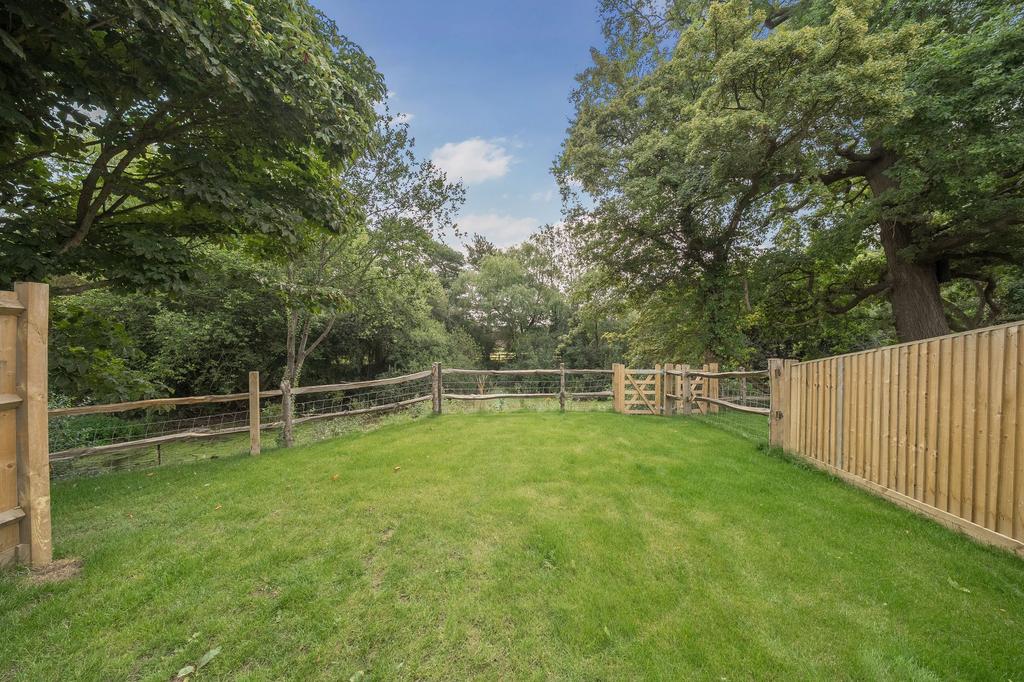 The garden is landscaped with an area of patio and lawn, views over the pond and 3 parking spaces