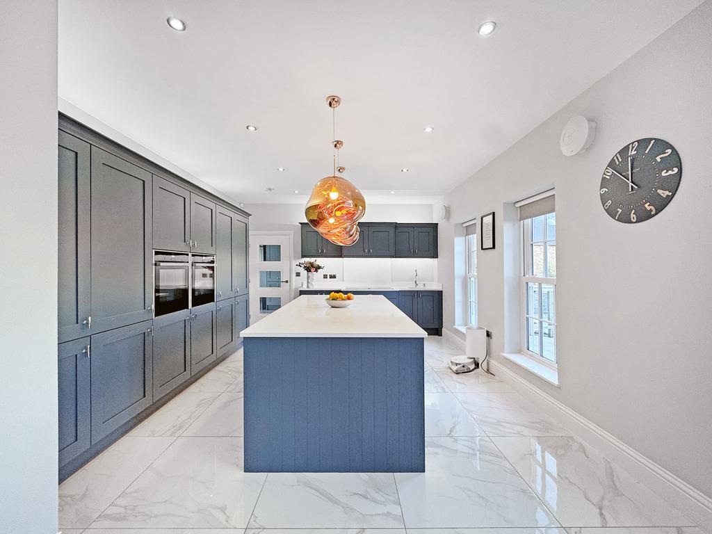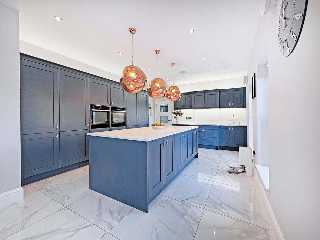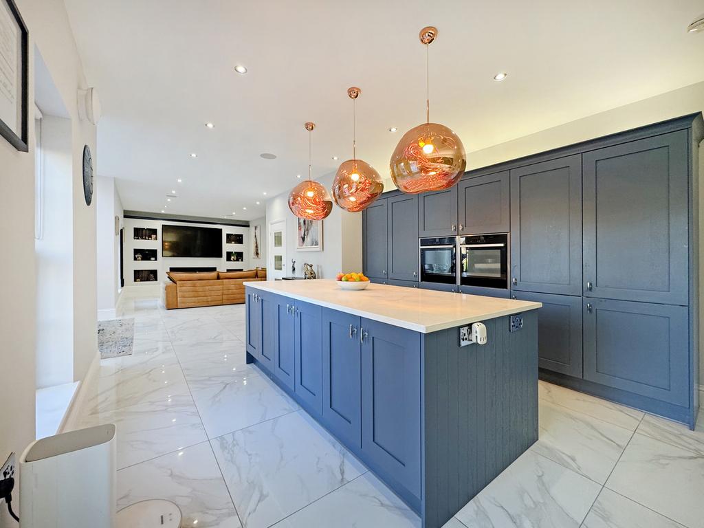 The kitchen is stunning with delightfully modern solid wood blue units and contrasting white quartz worktops, with an impressively large central island creating a real statement piece within the space. Finished to an extremely high standard the kitchen has a wealth of integrated appliances inclusive of an Neff induction hob with twin motor extractor, 2x Neff hide & slide ovens, 2x high power additional wall extractor units, 2 integrated fridge-freezers, feature / accent lighting and integrated Sonos Speaker System. The dining space is centrally located within the open plan space directly underneath the lovely roof lantern. The family room enjoys a feature TV Media wall with an integrated remote controlled electric fire, state-of-the- art 86” LG Smart TV, 6 nooks all with double sockets and Sonos Speaker System. Underfloor heating runs throughout the space. The property benefits from a water softener.