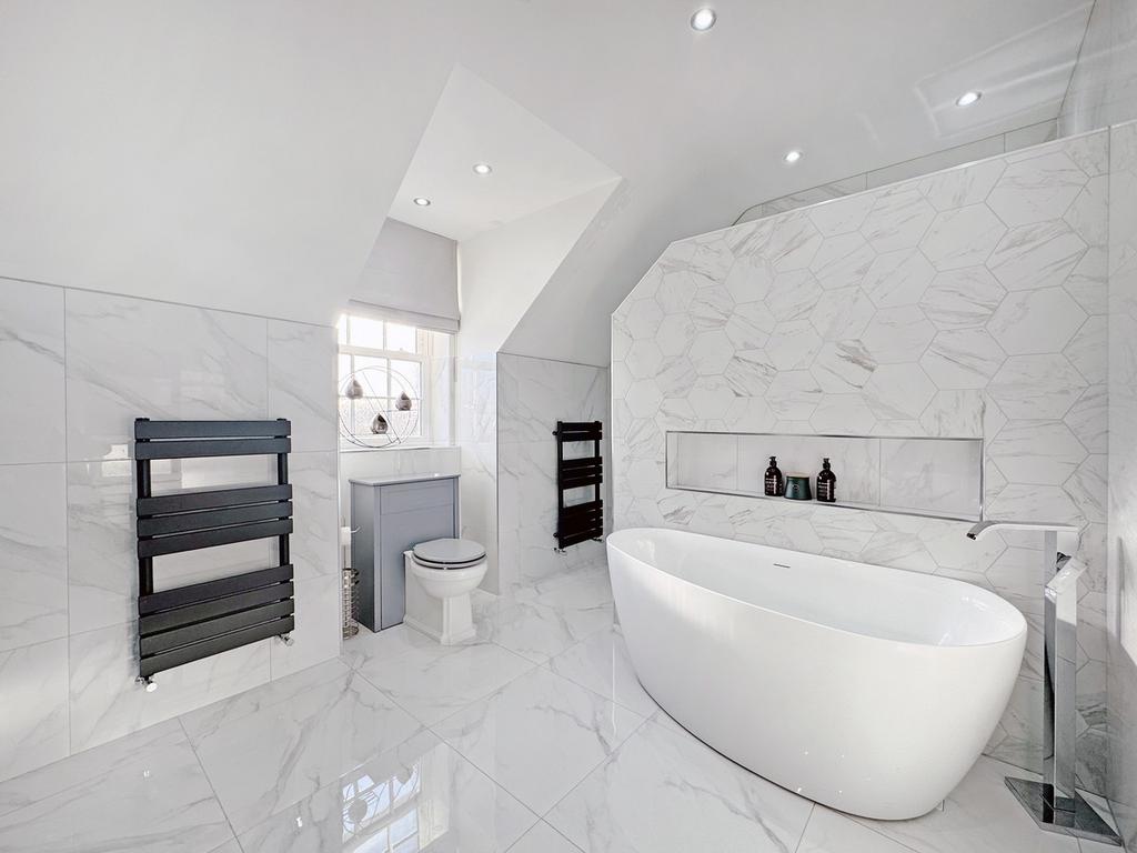 The Principal master bathroom is a beautiful space, finished to an extremely high standard. Natural light streams into the space via a slide & sash dormer window. A large freestanding bath plays centre stage as an elegant main feature with chrome floor standing taps, with a large walking shower behind. The bathroom is fully tiled throughout with white marbled tiles. The adjoining wall plays host two modern grey vanity units with illuminated circular heated mirrors, one either side of the door. The bathroom also features low flush WC, three towel radiators, extractor and underfloor heating.