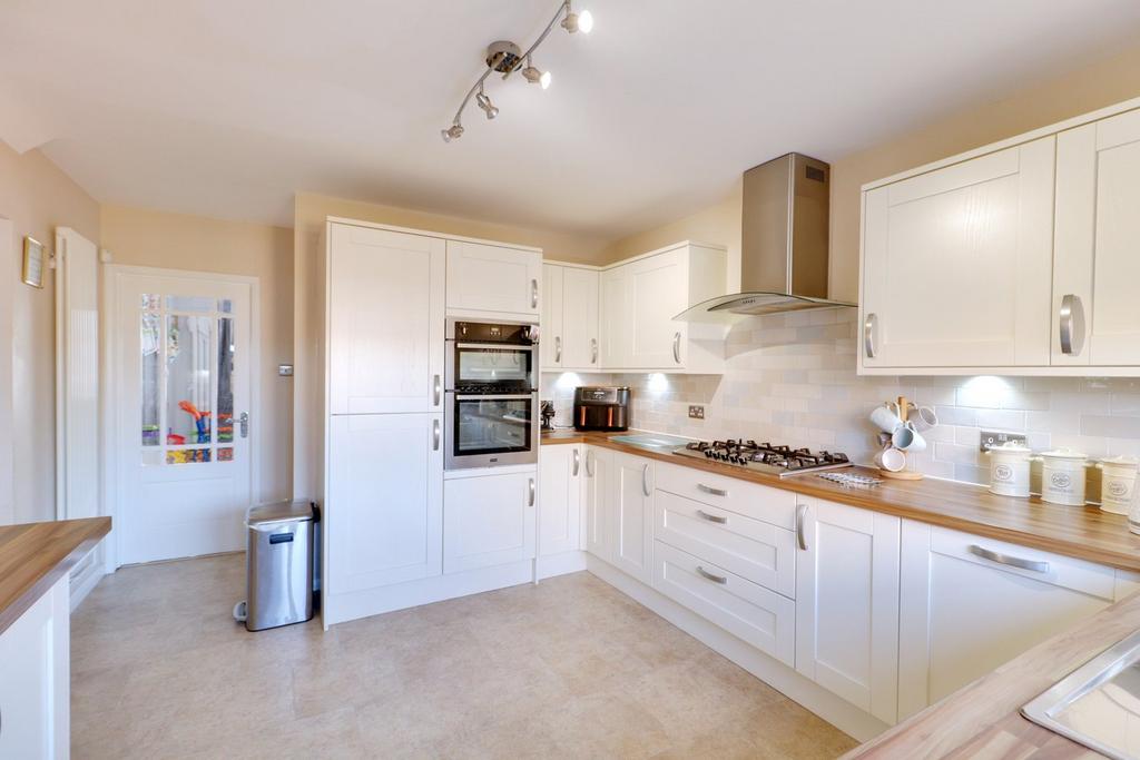 4.97m x 3.40m (16' 4" x 11' 2") Spotlight bar to ceiling, double glazed windows to rear, a range of matching wall and base units, laminate worksurfaces, one and a half bowl inset sink and drainer with mixer tap, integrated double oven, integrated fridge, integrated freezer, Integrated washing machine and dishwasher, tiled splashbacks, vertical radiator, Karndean flooring.