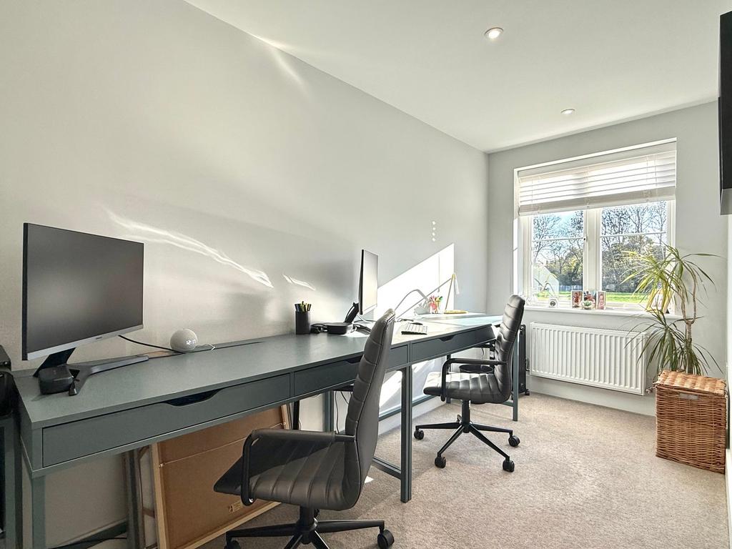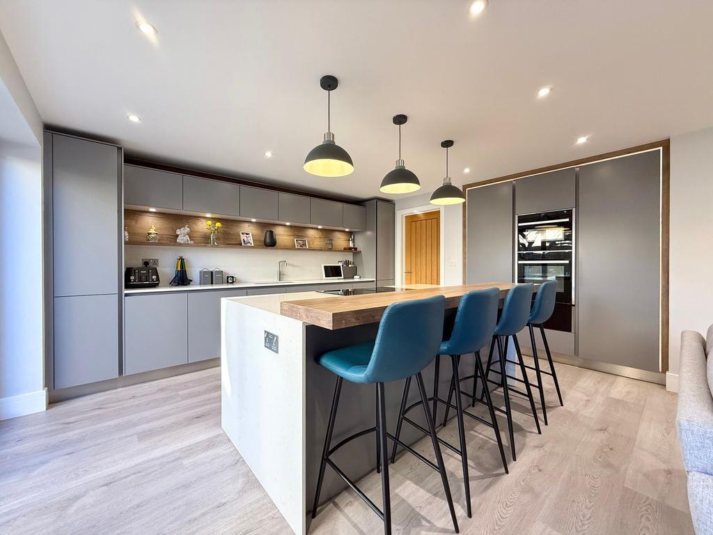 Extended and refurbished to an exceptional standard by the current owners, the house now boasts an expansive ground floor with four/five versatile reception spaces. At its heart is a stunning open-plan kitchen/dining/family room featuring high-spec integrated appliances, a large central island and elegant bi-fold doors opening directly onto the rear garden. A spacious sitting room with electric fire in the style of a wood burner, a dedicated office with space for two workstations, a family/play room, a utility room and a downstairs W/C complete the ground floor. Upstairs, the first floor offers four generous double bedrooms, each with built-in wardrobes. Two bedrooms benefit from their own en-suite shower rooms, including a beautifully appointed master en-suite with both a walk-in shower and a separate bath. A family bathroom serves the remaining bedrooms.