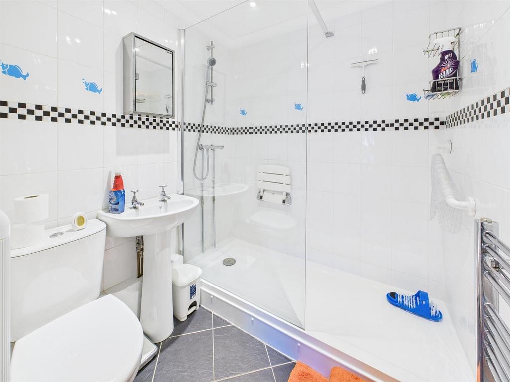 Bathroom - Suite comprising low level WC, pedestal wash hand basin with double taps over, walk in shower unit with wall mounted shower unit, wall mounted heated towel rail, tiled walls.