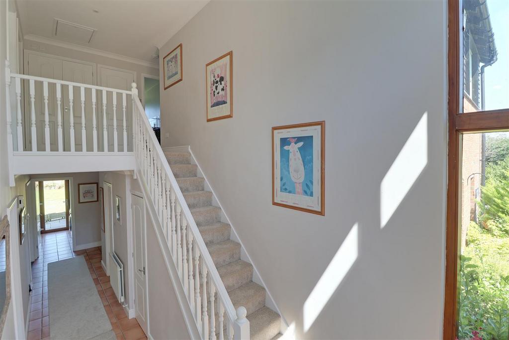 Entrance Hall - Floor-to-ceiling double-glazed windows to both side elevations, stairs to first floor, understairs cupboard, radiator, tiled flooring, doors to all internal rooms.