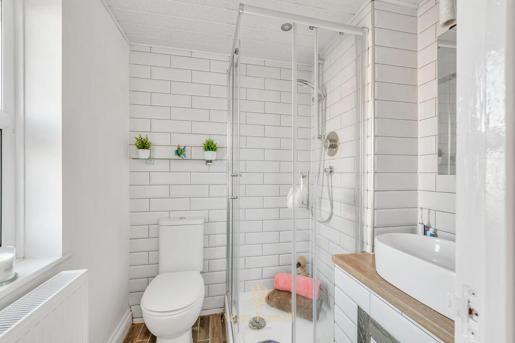 The master bedroom is generously proportioned, with a bay window to the front and built in wardrobe, and an ensuite shower room with WC, vanity unit, wash basin, and shower cubicle.