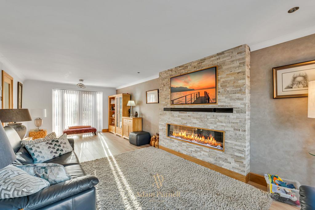 The spacious, light filled lounge features laminate flooring, a striking media wall with feature fire, and a bay window overlooking the front garden. Patio doors open onto the rear garden, while an internal door leads seamlessly through to the kitchen/dining area.