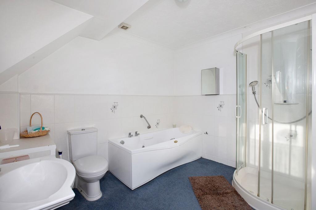 Having a side facing timber framed double glazed window taking in glimpses of the estuary and having views towards rolling countryside. There is a four-piece suite with tiled surrounds comprising a “Jacuzzi” bath, a curved shower cubicle with seat and electric shower, a WC and a pedestal wash hand basin. There is a ladder style radiator/towel rail and a fitted dressing table with shaver point above along with an extractor fan.