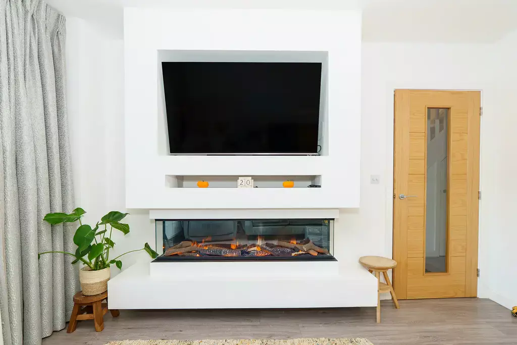 - Lovely living room with media wall and contemporary inset electric fire