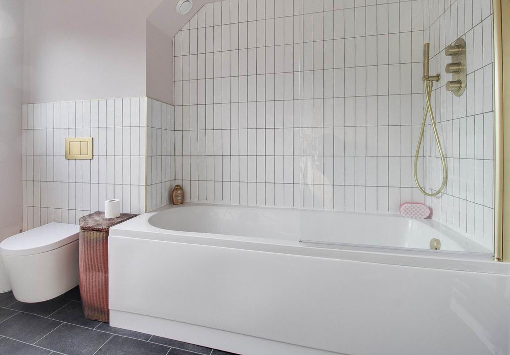 10'6 x 10'7. Luxurious modern suite comprising contemporary wash basin with matt grey drawers under, fitted shelving and shaver/toothbrush point. Low level w.c. Deep panelled bath with Bristan independent drench shower with hand shower attachment. Attractive tiled bath area and basin splashback. Airing cupboard with electric under rail heater and slatted shelves. Ladder towel rail. Modern flooring. Recessed spotlights. New dormer window.