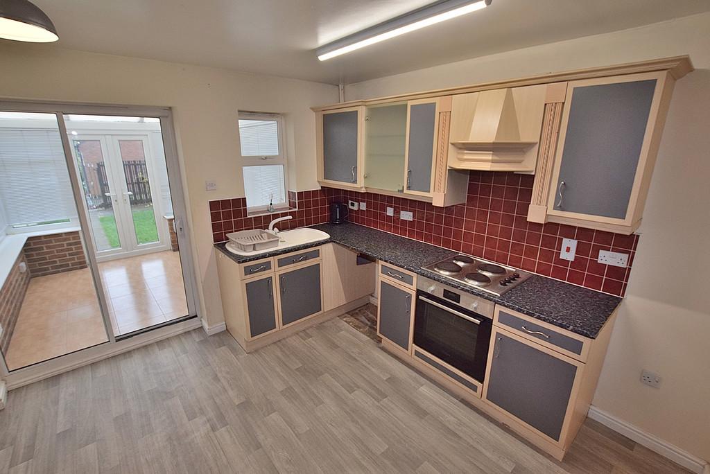 DINING KITCHEN With space for a table, the kitchen is fitted with a range of wall and base units with complimenting countertops. There is an electric cooker, space for a fridge freezer, plumbing for a washing machine, a radiator and a pair of doors opening into the conservatory.