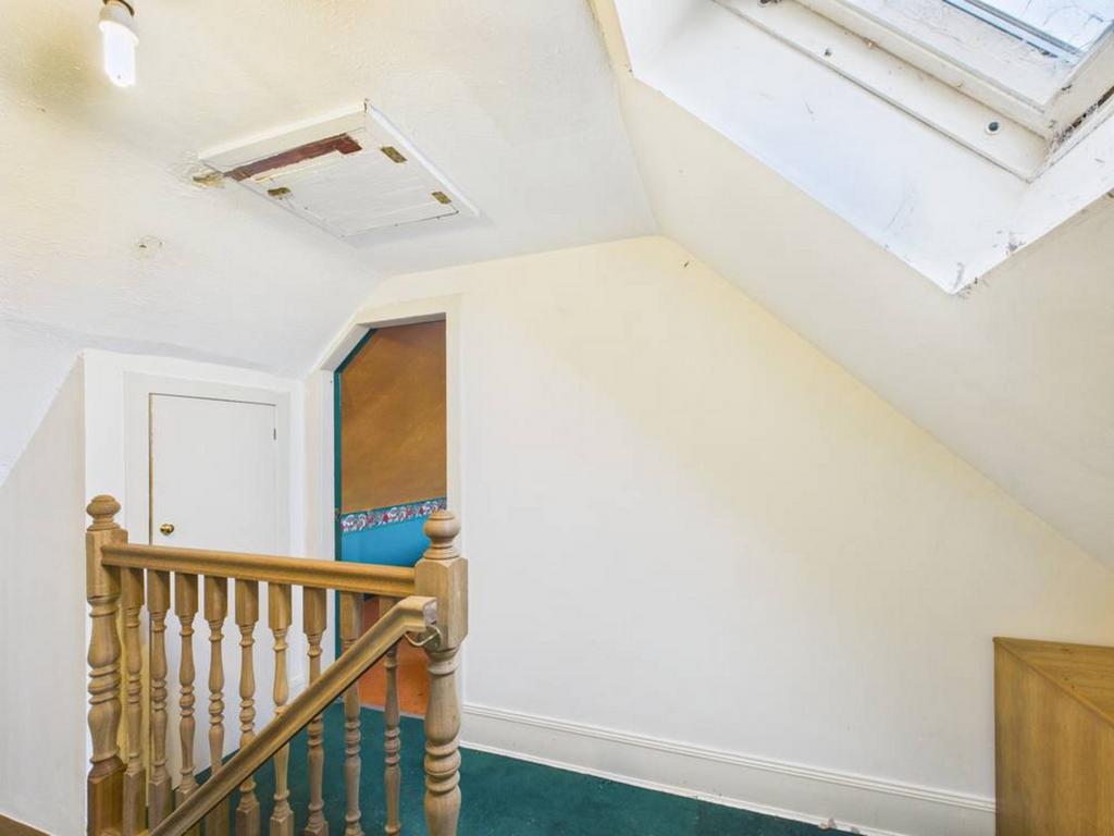 Carpeted upper landing with attic access, skylight, and doors to both bedrooms. Sloped ceilings and reduced headroom in places.