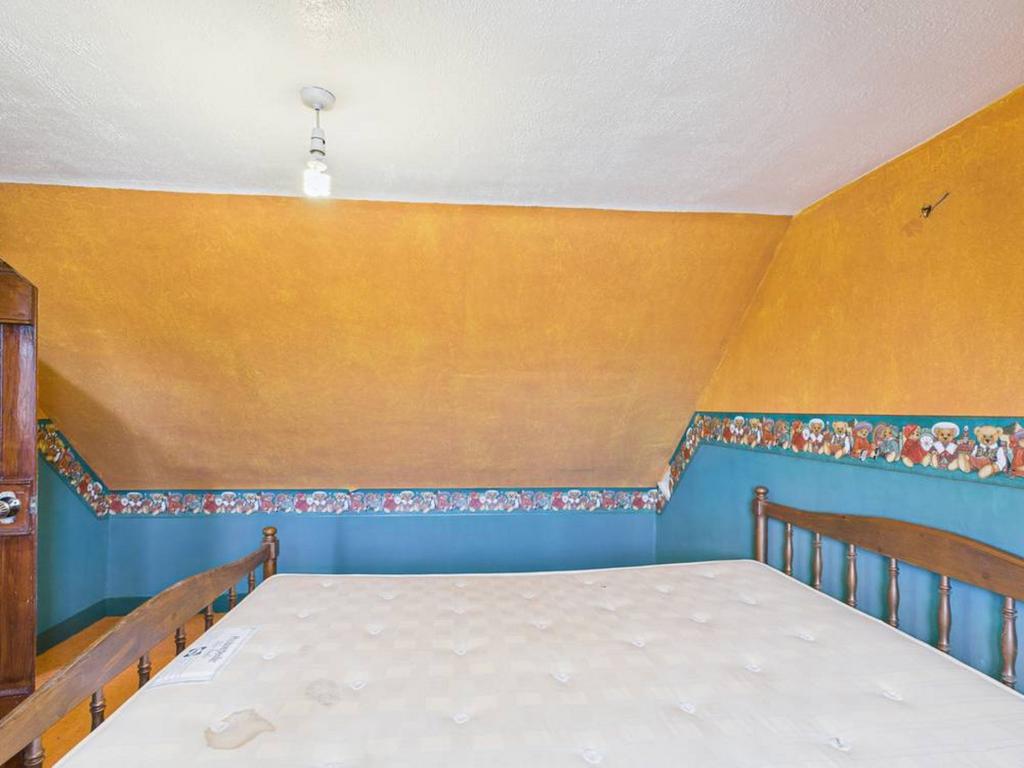 Dormer window, radiator, and vibrant child-friendly décor with teal/orange walls and teddy bear border.