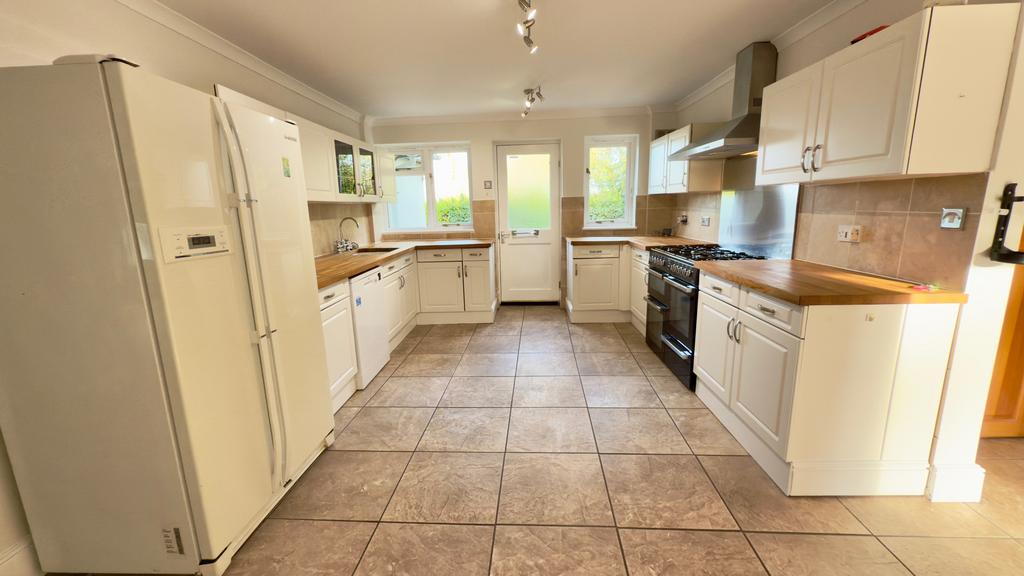 With a range of eye level and base painted kitchen units with wooden worktop over. Inset Butler sink with hot and cold mixer tap. Range gas cooker with extractor chimney hood over. Hotpoint Dishwasher, Samsung American-style fridge/freezer, Smoke alarm. Access to the loft (NB not for tenants' use). Double radiator. Tiled floor. Double-glazed sealed unit window and door to the rear garden. Tiled splashback.
